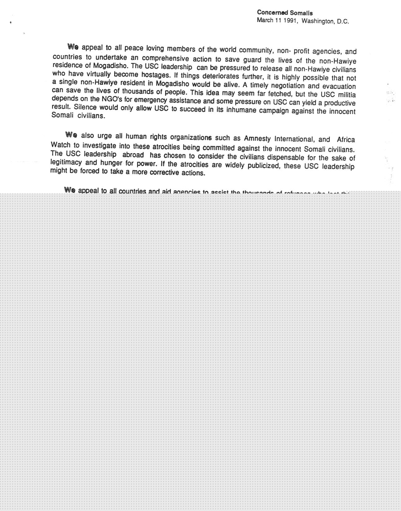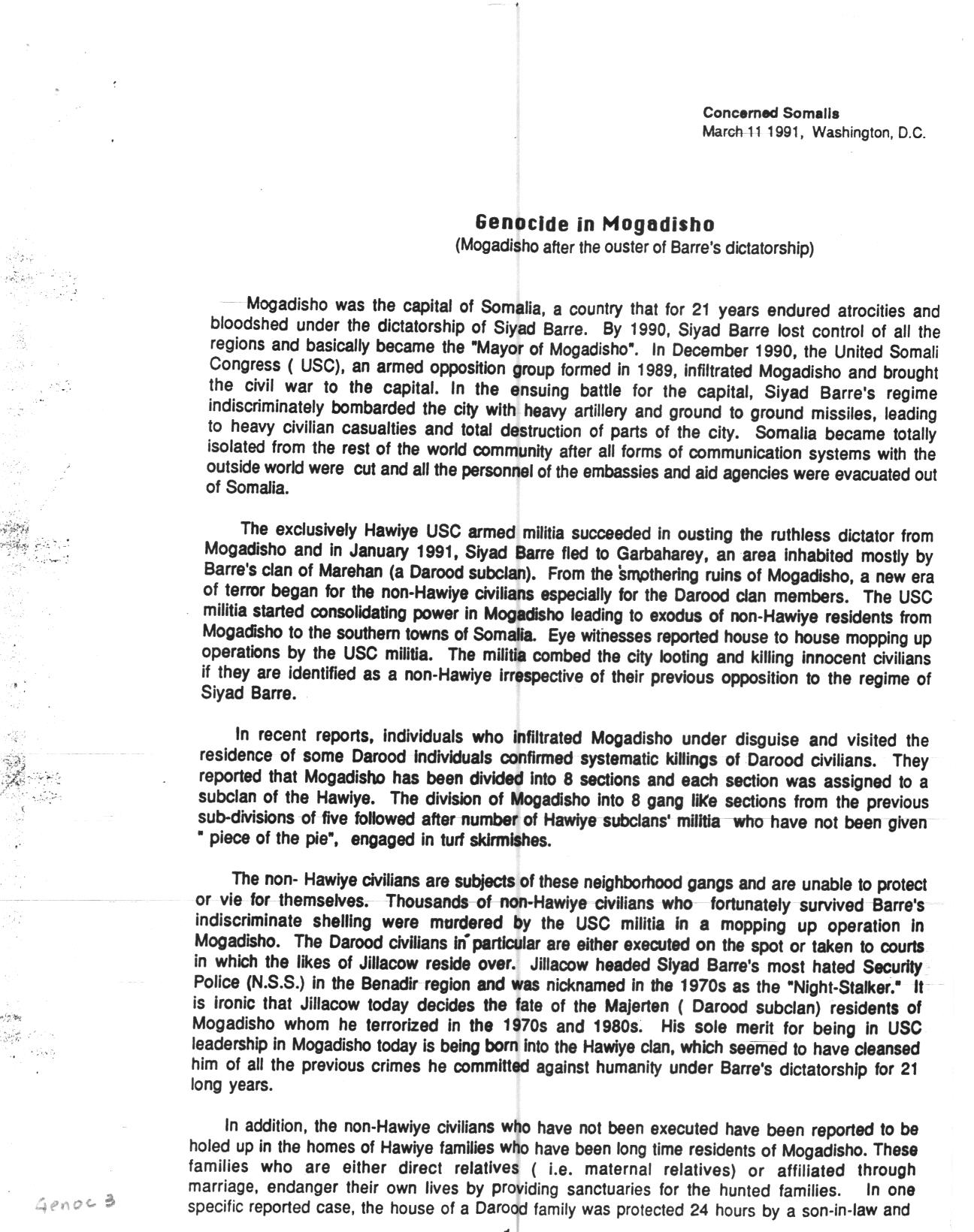 This document was released by a group calling itself Concerned Somalis in Washington DC in March 1991 in a